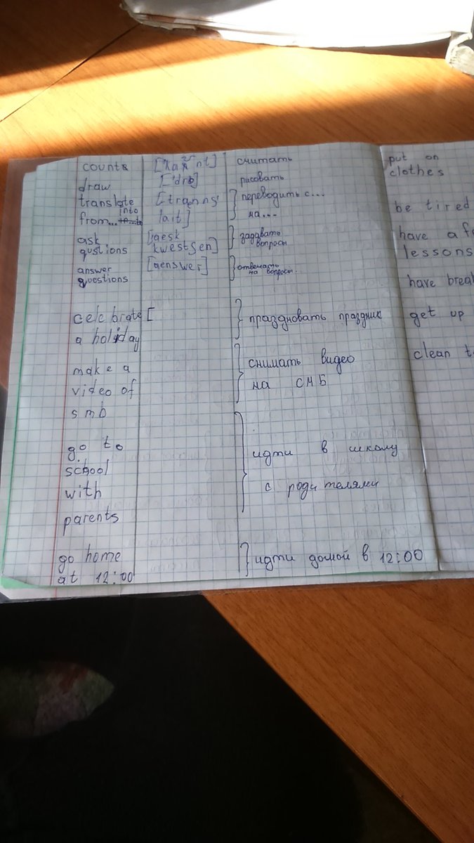 Celebrate a holiday /ˈselɪbreɪt e ˈhɒlədeɪ/, make a video of smb (somebody) /meɪk e ˈvɪdiəʊ əv ˈsʌmbədi/ - снимать кого-нибудь на видео, go to school with parents /ɡəʊ tə skuːl wɪð ˈpeə.rənts/, go home at twelve /ɡəʊ həʊm ət twelv/.