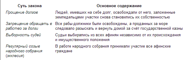 Суть законаОсновное содержаниеПрощение долгов Людей, имевших на себе долг, освобождали от него, заложенные земледельцами участки снова становились их собственностью Запрещение обращать в рабство за долги Все рабы-должники были освобождены, а проданных за море следовало разыскать и вернуть домой за счёт государственной казны Выборность судей Судьи выбирались из всех афинян независимо от их происхождения и имущественного положения Регулярный созывнародного собрания(экклесия) В работе народного собрания принимали участие все афинские гражданеПриложения: