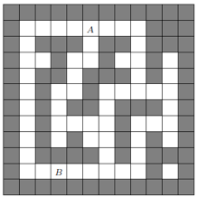 Перед вами карта лабиринта (серым цветом закрашены стены - по ним нельзя пройти). Робот находится в клетке A. За один шаг он может переместиться в соседнюю по стороне клетку, если она проходима. Какое минимальное количество шагов нужно роботу, чтобы добраться до выхода в клетке B?