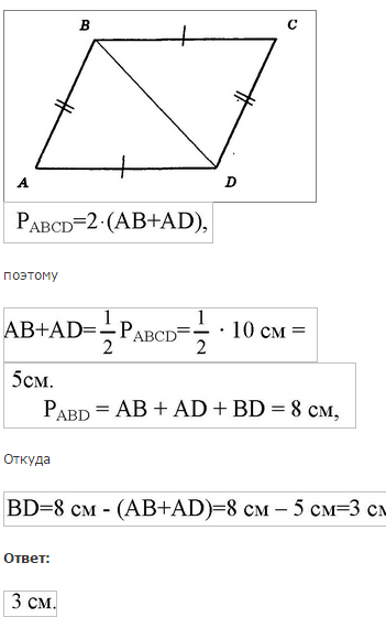 периметр параллелограмма АВСD равен 10 см а периметр треугольника АВD 8см .Какова длинга диагогали BD
