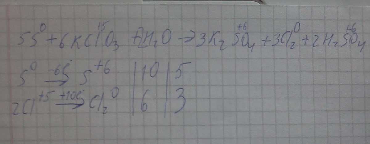 Расставьте коэффициенты методом электронного и электронноионного баланса в следующем уравнении химической реакции: S+KClO3+H2O ->K2SO4+Cl2+H2SO4