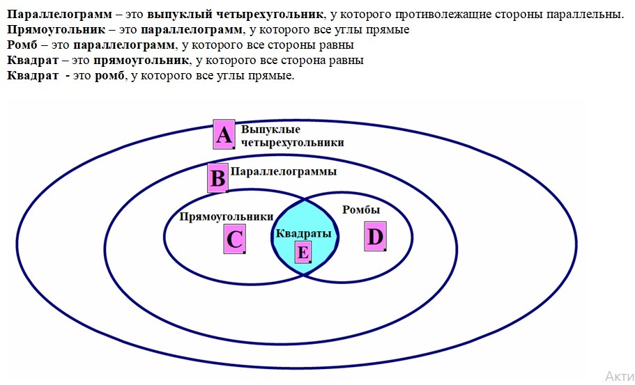 Отношения между множествами всех выпуклых четырехугольников (А), параллелограммов (В), прямоугольников (С), ромбов (Д) и квадратов (Е) изображены на рисунке 6. Покажите каждое из множеств