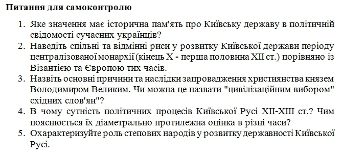 3) Основні причини запровадження християнства були наступними: політична ( прагнення Володимира зміцнити державу і її територіальну єдність), міжнародна ( прийняття християнства укріпляло стосунки між Візантією і відкиривало шлях до Європи), соціальні (наростаюча соціальна неоднорідність створювали умови для переходу до більш складної світоглядної системи). Наслідки: укріпилися стосунки з Візантєю, країнами Європи, хоча була проблема "вибору віри", бо були іслам, буддизм, іудаїзм і питання - якій вірі давати перевагу. Вибір Володимира не можна назвати "цивілізаційним", бо його нав'язали не тількі Русі, а й іншим західним країнам.