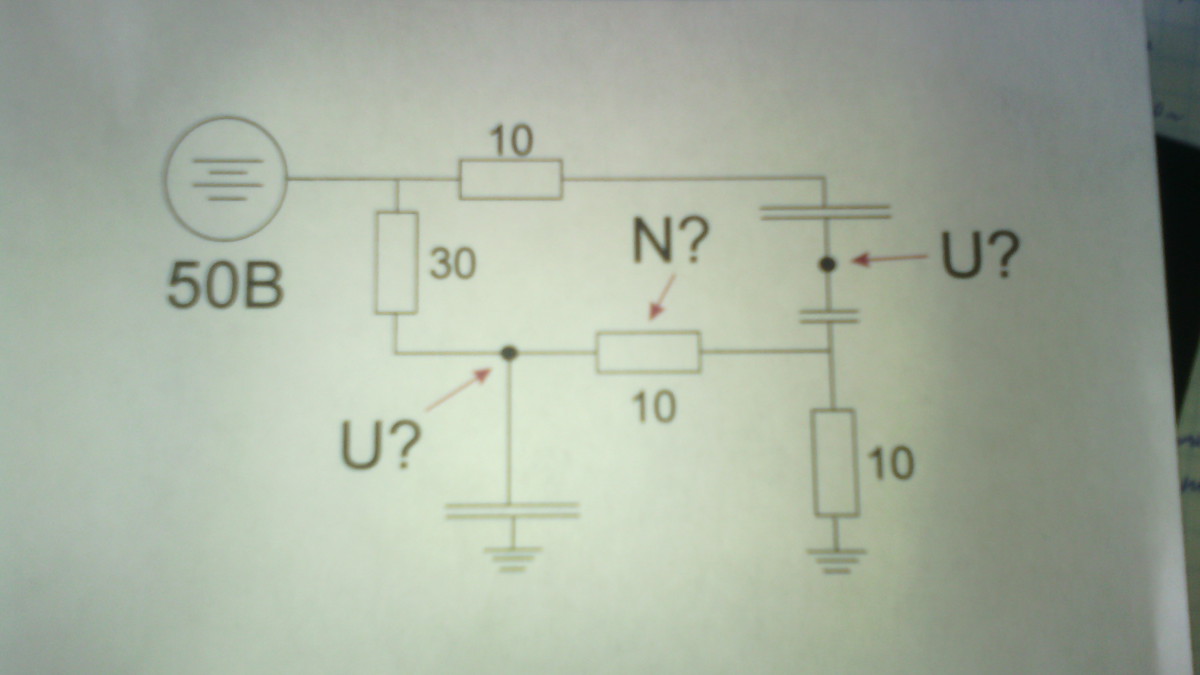 Всего 50Ом, источник - 50В, ток - 1А, мощность на том резисторе где буква N нарисована, составит I^2*R=10Вт, левое напряжение U= 1А*(10+10)Ом=20В, правое напряжение U болтается в воздухе и сказать сколько там - невозможно. Да сколько угодно.
