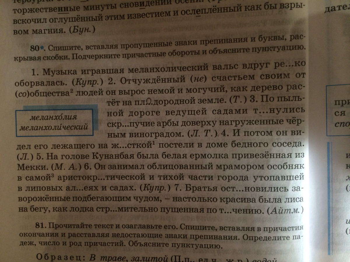 Музыка,( игравшая меланхолический вальс), резко оборвалась. (Отчужденный несчастьем своим от сообщества людей), он вырос немой и могучий, как дерево растет на плодородной земле. По пыльной дорооге, (ведущей садами), тянулись скрипучие альбы доверху нагруженные черным виноградом.