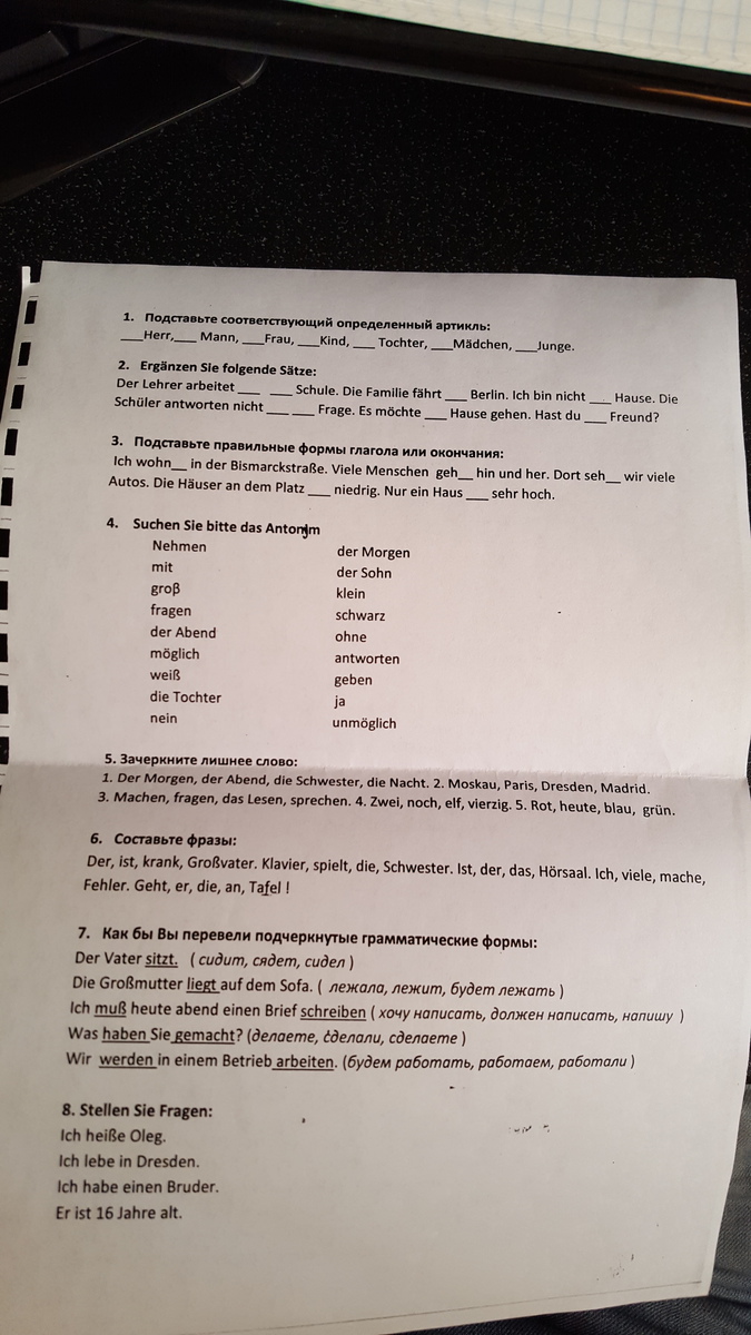 6. Der Grossvater ist krank. Die Schwester spielt Klavier. Das ist der Hoersaal. Ich mache viele Fehler. Er geht an die Tafel.