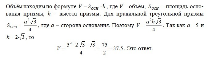 сторона основания правильной треугольной призмы A1 ABC A1B1C1 равна 5, а высота этой призмы равна 2корня3. найдите обьём призмы ABCA1B1C1