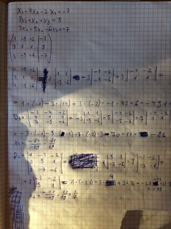 Помогите пожалуйста решить систему линейных уравнений по методу Крамера и методу Гаусса, провести проверку.