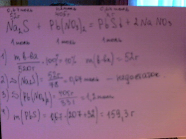 Вычислить массу осадка, образовавшегося при взаимодействии 520 граммов 10% раствора сульфида натрия и 405 граммов нитрата свинца.