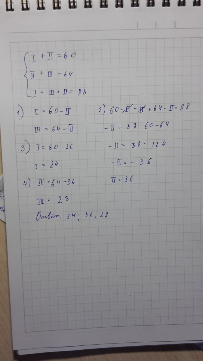 У входа в зоопарк продаются наборы открыток"Питомцы зоопарка ".В трех разных наборах 88 открыток. В первом и втором наборах 60 открыток, во втором и третьем наборах 64 открытки. Сколько открыток в каждом наборе?