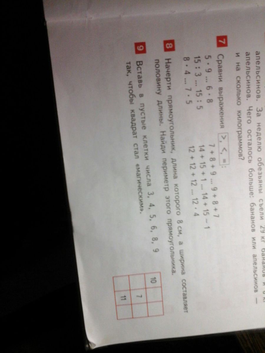 вставь в пустые клетки числа 3,4,5,6,8,9 так,чтобы квадрат стал "магическим ".