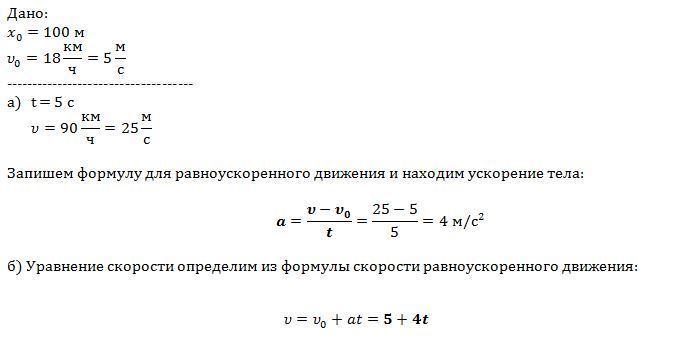 Тело движется из точки с координатой х0 = 100 м и начальной скоростью 18 км/ч.