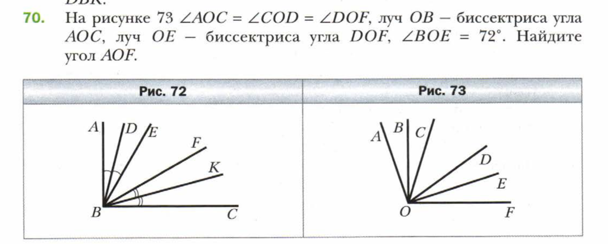 На рисунке 73 угол AOC = угол COD = угол DOF, луч OB - биссектриса угла AOC , луч OE - биссектриса угла DOF, угол BOE = 72 градуса . Найдите угол AOF (даю 30 баллов)