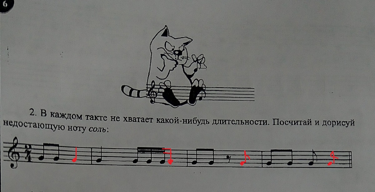 В каждом такте не хватает какой-нибудь длительности. Посчитай и дорисуй недостающую ноту соль