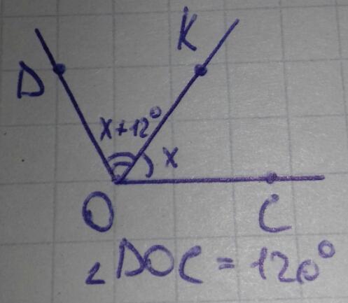 Луч ОК делит угол DOC на два угла .Найдите угол COK Если угол DOS=120° a угол KOD на 12°> угла COK