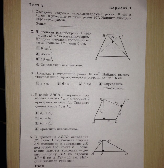 1. 8*(11/2)=44 или 11*(8/2)=44 ; 2. (bd*ac)/2=6*6/2=18 ; 3. 18/6/(1/2)=6 ; 4. Ha=Hb ; 5. bf-высота, уголА=45, значит треугольник abf-равнобедренный,af=bf=6,ad=af+fd=17,площадь =bf*(bc+ad)/2= 6*(1+17)/2=54
