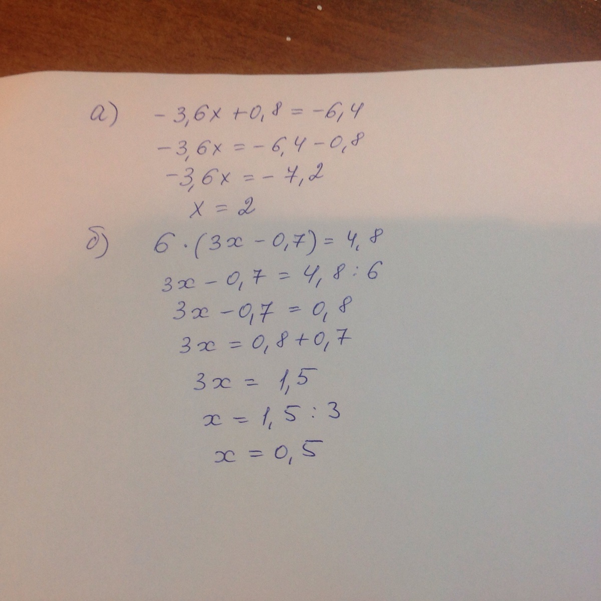 Помогите решить уравнения пожалуйста завтра проверка (((( а)-3,6х+0,8=-6,4 б) 6 умножить (3х-0,7)=4,8 прошу помогите !!!!!