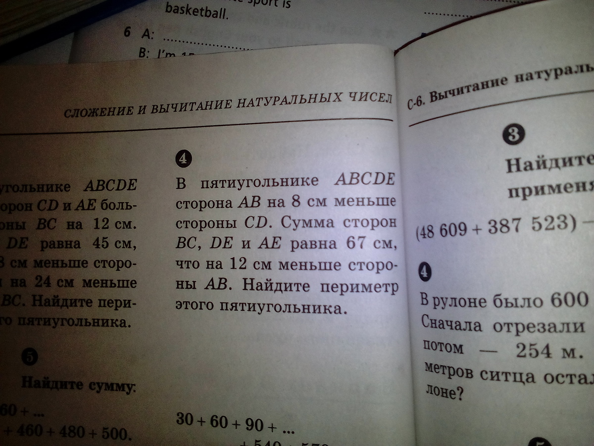 Периметр-сумма длин всех сторон, АВ больше суммы сторон ВС,DE,АЕ на 12 см., следовательно 67+12=79 (см) сторона АВ, а АВ на 8 см меньше стороны CD, 79+8=87 (см) и периметр 67+79+87=233(см)