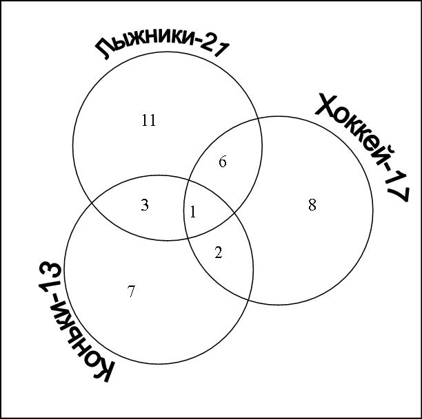 Прибавим к этим 8, еще 6-из лыжников, 2 коньков и 1 лыже-конька и получим 8+6+2+1=17