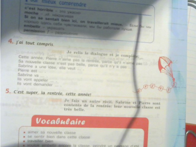 Sa nouvelle classe n'est pas belle, parce qu'ill n'y a pas de plantes, pas de décorations, plus de dessins,