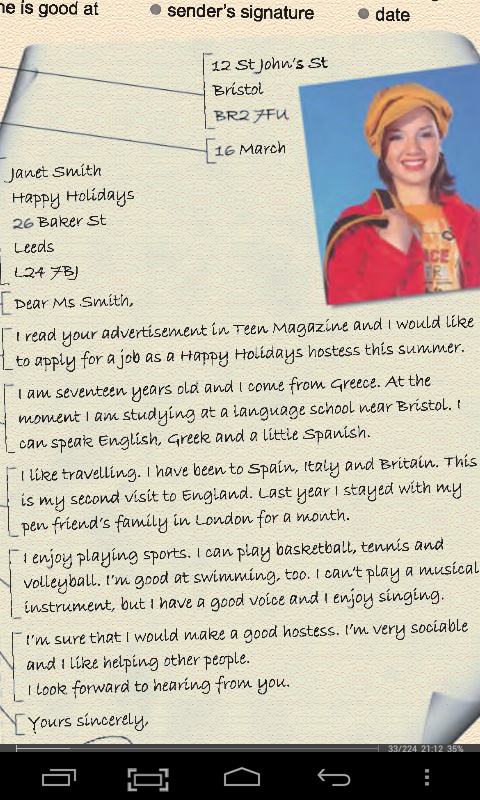 прочитати Ваше оголошення в підлітковий журнал ANCI я хотів_to Застосувати для роботи в якості Н-Н-Appy olldays господині це sum.vv.er.Я урни сімнадцять років, і я з, Омі -від Грецію. Біля, момент я вчуся в мовній школі near'Bristol. !_ _ _ _ Кажу англійською, C ^ сморід і трохи по-іспанськи.! lllee подорожі. Я був в Іспанії, Італії та Великобританії. цеЄ м у другий візит до Англії. Торік л залишився з моїм-сімейство пера -friend у Лондоні -для місяці.Мені подобається займатися спортом. Я можу здерти basleetball, теніс іволейбол. Я добре плавати, теж. (Не може грати музичнийінструмент, але у мене є хороший голос і (насолодитися співом.Я впевнений, що л буде хорошим господиня. Я дуже товариськийі мені подобається допомагати otherpeople.Я loote чекаємо від вас.Щиро Ваш,Марла Bapass