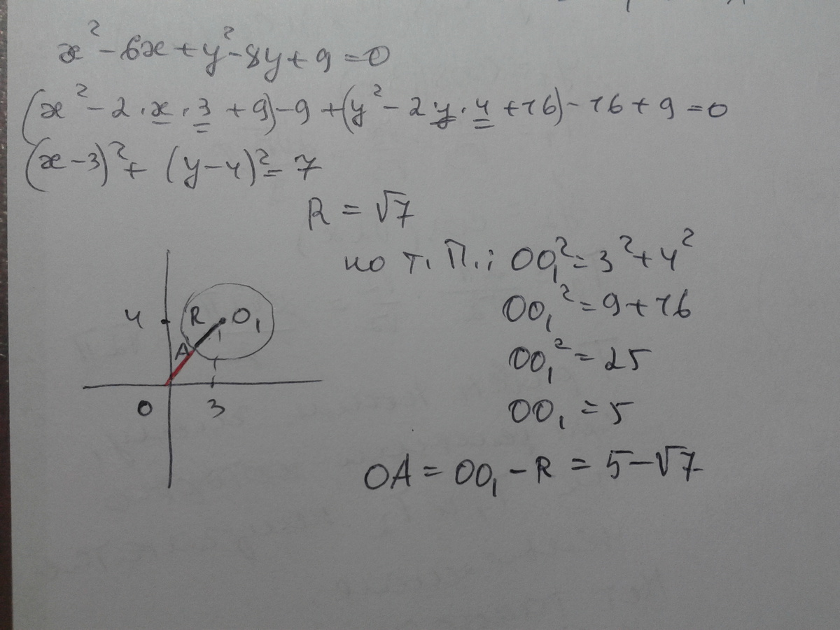 Найти расстояние от начала координат до окружности x^2 -6x + y^2 - 8y + 9=0. У меня центр окружности получился (3;4), но расстояние до центра не спрашивают.