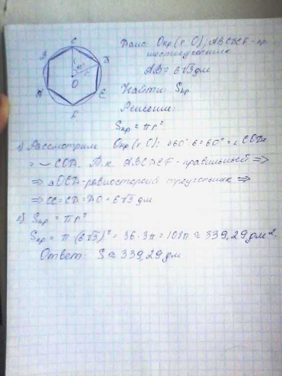 Найдите площадь круга и длину его ограничивающей его окружности если сторона правильного шестиугольника вписанного в него равна 6√3 дм.