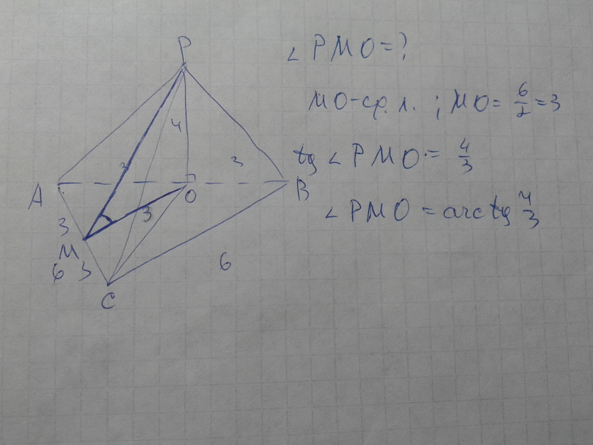 3.Дана пирамида РАВС. Найти величину двугранного угла с ребром АС, если Грань АВС – правильный треугольник, точка О – середина отрезка АВ, АВ=6см, прямая ОР перпендикулярна плоскости АВС, ОР=4см.
