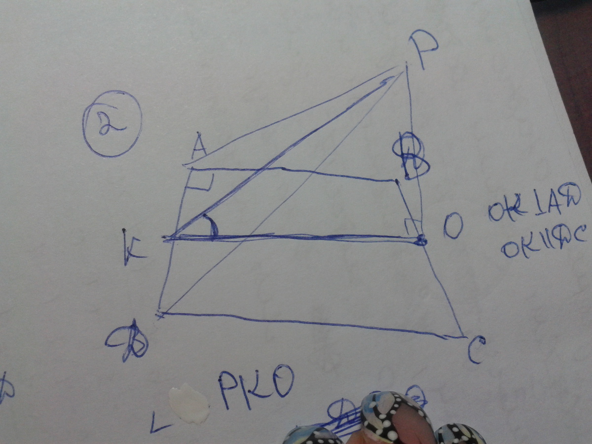 2.Построить линейный угол двугранного угла с ребром АД, если АВСД – трапеция, угол ВАД равен 90о, точка О принадлежит отрезку ВС, прямая РО перпендикулярна плоскости АВС.