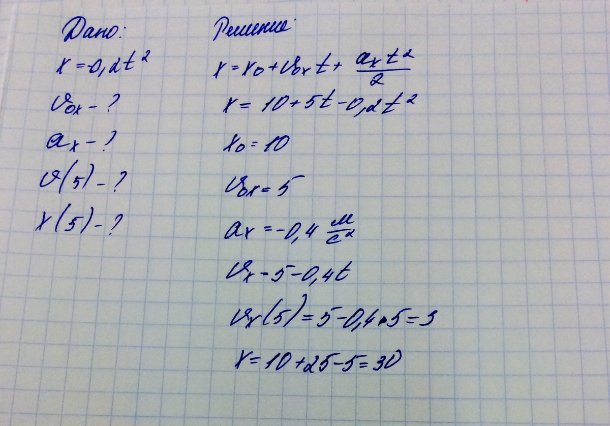Положение катящегося вдоль оси 0x по полю футбольного мяча задается уравнением x=10+5t-0.2t*2.Определите проекцию начальной скорости и ускорение. Чему равна координата меча и проекция его скорости в конце 5-й секунды?