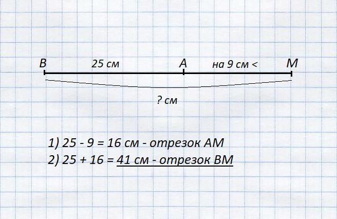 Точка А принадлежит отрезку ВМ,ВА=25 СМ,ОТРЕЗОК АМ НА 9 СМ МЕНЬШЕ ОТРЕЗКА ВА.НАЙДИТЕ ДЛИНУ ОТРЕЗКА ВМ.