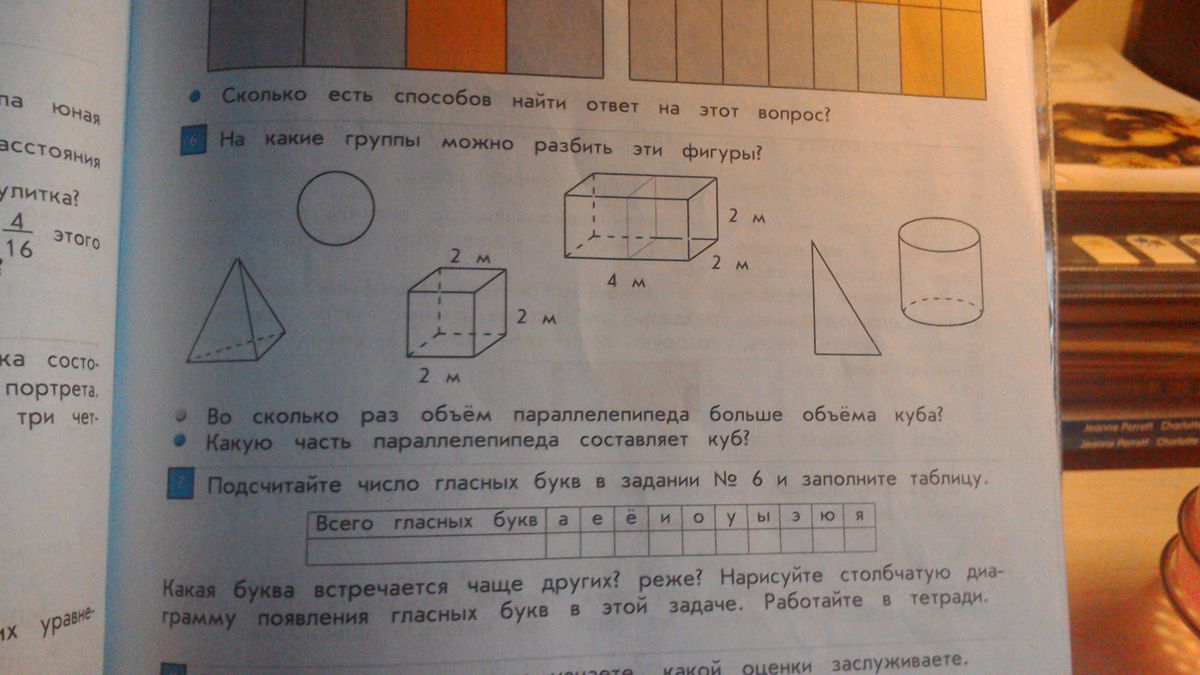 на группу объёмные или нет ,и ещё на три группы на круглые ,квадратные,треугольные фигуры ,на с под писанным периметром и нет