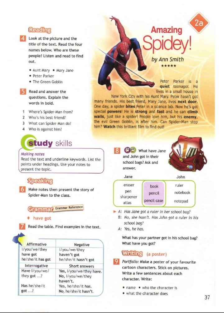 #Peter Parker- He is a quiet teenager. He lives in a small house in New York city. One day , a spider bites him in a science lab. Now he has got special powers. He is Spiderman.