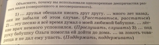 Расставаясь, друзья обещали писать друг другу. Расставаясь много лет назад, они не забыли об этом случае. Прослушивая эту песню, я все время думал о моей любимой бабушке. Слушая легкие, врач немного успокоился. Поддерживая под руку бабушку, Ольга помогла ей дойти до дома. Поддерживая за локоть товарища, я не дал ему упасть.