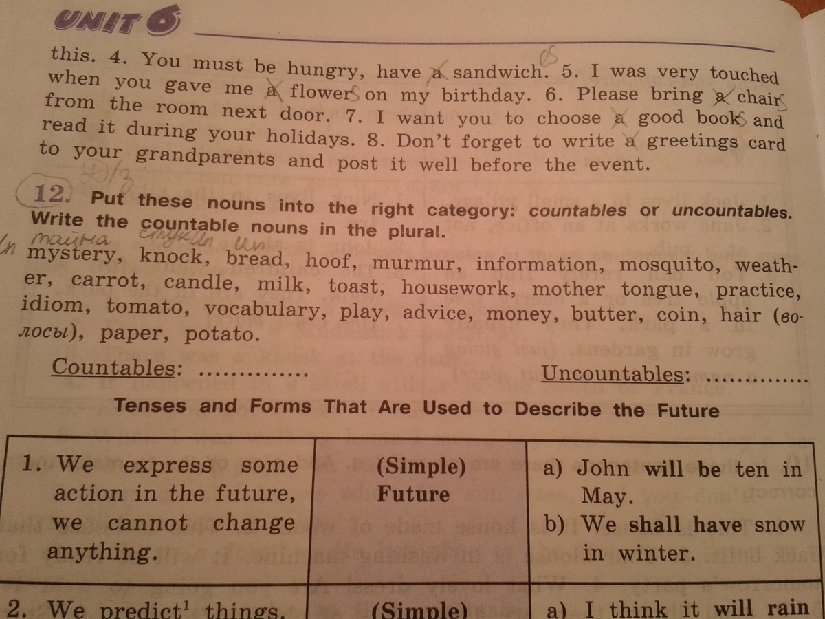 Uncountables: knock, bread, information, weather, milk, housework, mother tongue, money, butter, hair