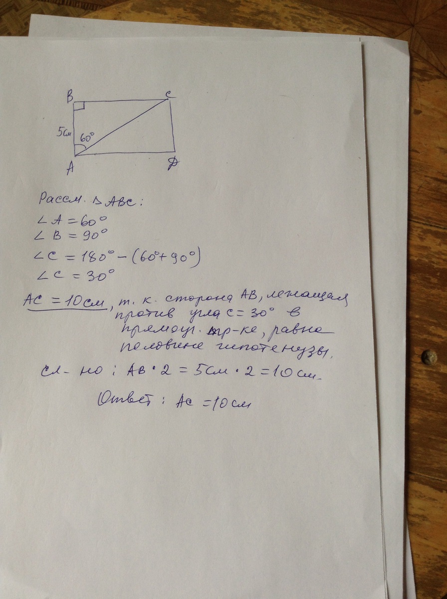 меньшая сторона прямоугольника,длина которой равна 5 см,образует с диагональю угол 60 градусов.Найдите длину диагонали прямоугольника СРОЧНО ПОЖАЛУЙСТА