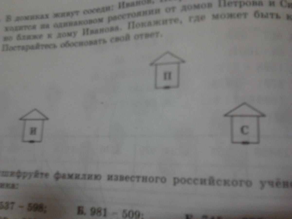 В домиках живут соседи: Иванов, Петров и Сидоров. Колодец находитсянаодинаковомрасстоянии от домов Петрова и Сидорова, но ближе к дому Иванова.Подскажите, где может быть колодец. Постарайтесь обосновать свой ответ. (Если изобразить на схеме, то от дома Петрова до дома Сидорова - 3 см; от Петрова до Иванова - 5,3 см; от Иванова до Сидорова 7,5 см)