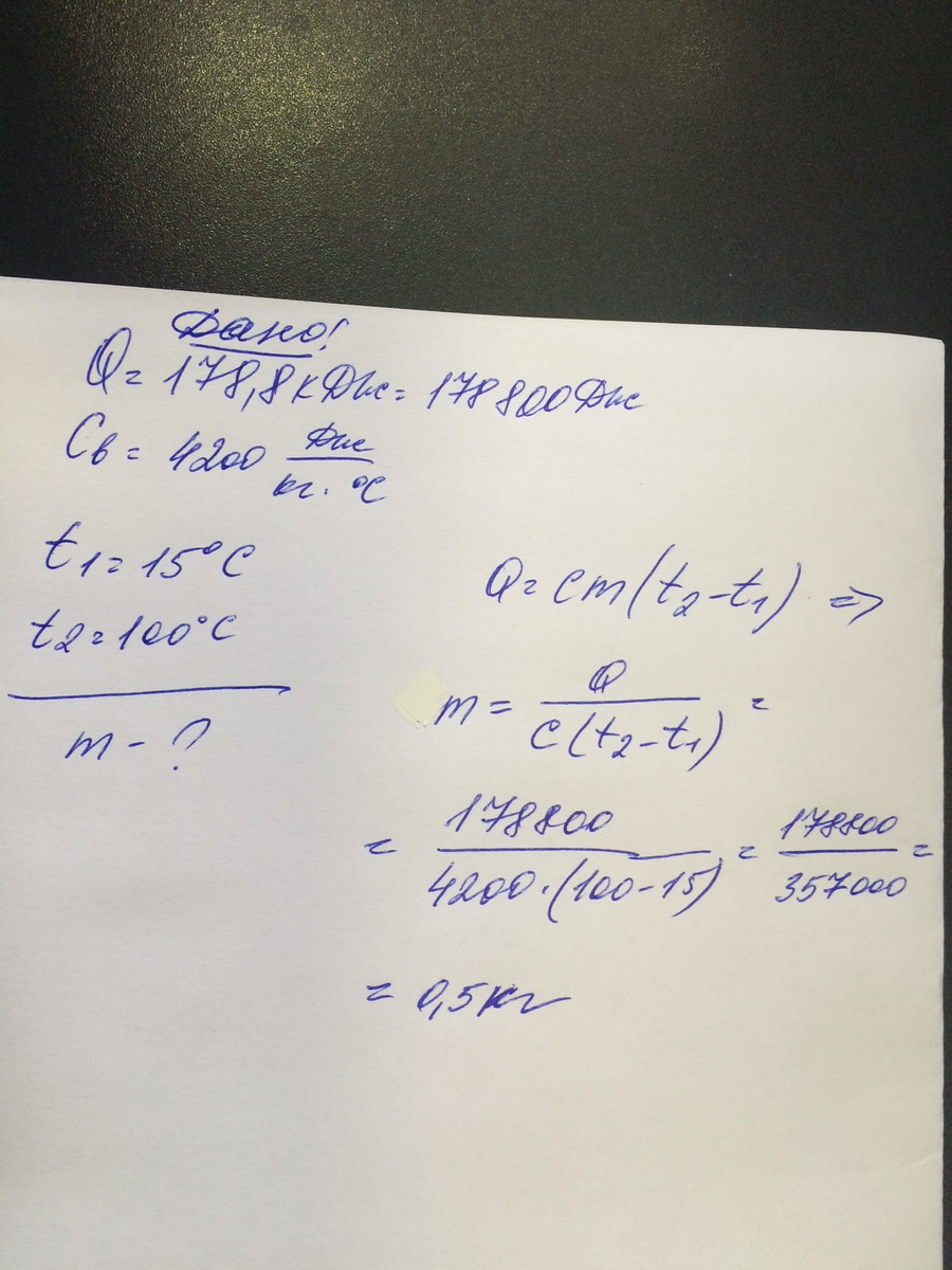при нагревании воды от 15 до 100 градусов Цельсия внутренняя энергия увеличивается на 178,8 килоджоуль Найдите массу нагреваемой воды