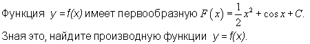 Функция f(x) имеет первообразную F(x)=(1/2)*x^2+cosx+C Зная это.найдите производную функции y=f(x) Очень прошу.По силе своих мозгов помогу )