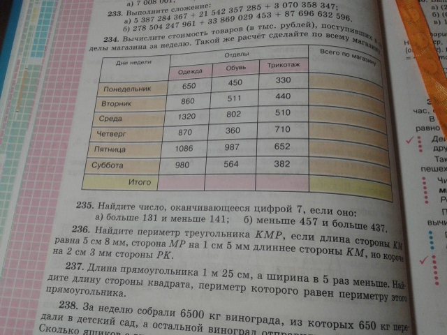 №234 1) 650+450+330=1430 - всего по маг. за ПН 2) 860+511+440=1811 - за ВТ, 3) 1320+802+510=2632 - за СР, 4) 870+360+710=1940 - за ЧТ, 5) 1086+987+652=2725 - за ПТ, 6) 980+564+382=1926 - за СБ, 7) 1430+1811+2632+1940+2725+1926=12464 - всего по маг. за неделю, 8)650+860+1320+870+1086+980=5766 - за одежду, 9) 450+511+802+360+987+564=3674 - за обувь, 10) 330+440+510+710+652+382=3024 - за трикотаж