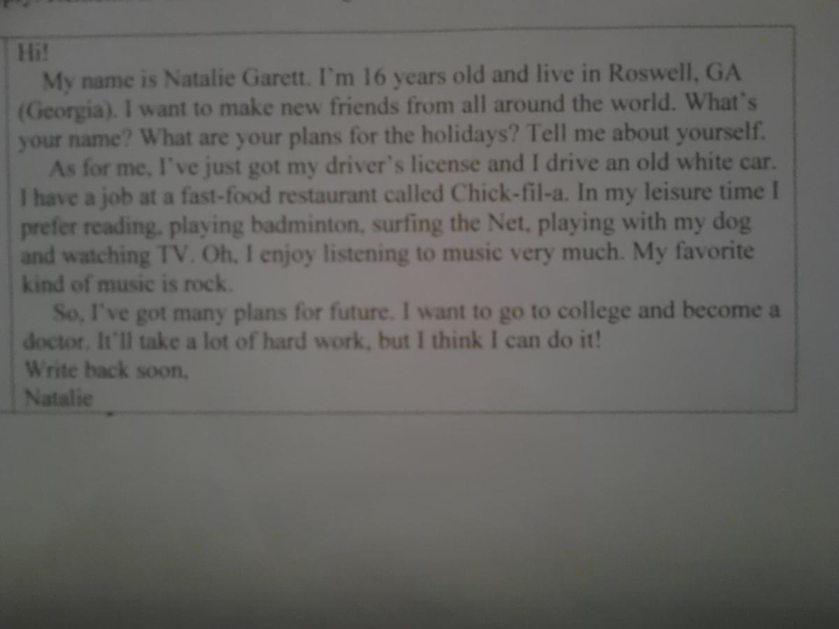 Меня зовут Натали Гаретт. Мне 16 лет и я живу в городе Розвел, штат Джорджия. Я хочу найти друзей со всего мира. Как тебя зовут? Какие у тебя планы на каникулы? Расскажи мне о себе.