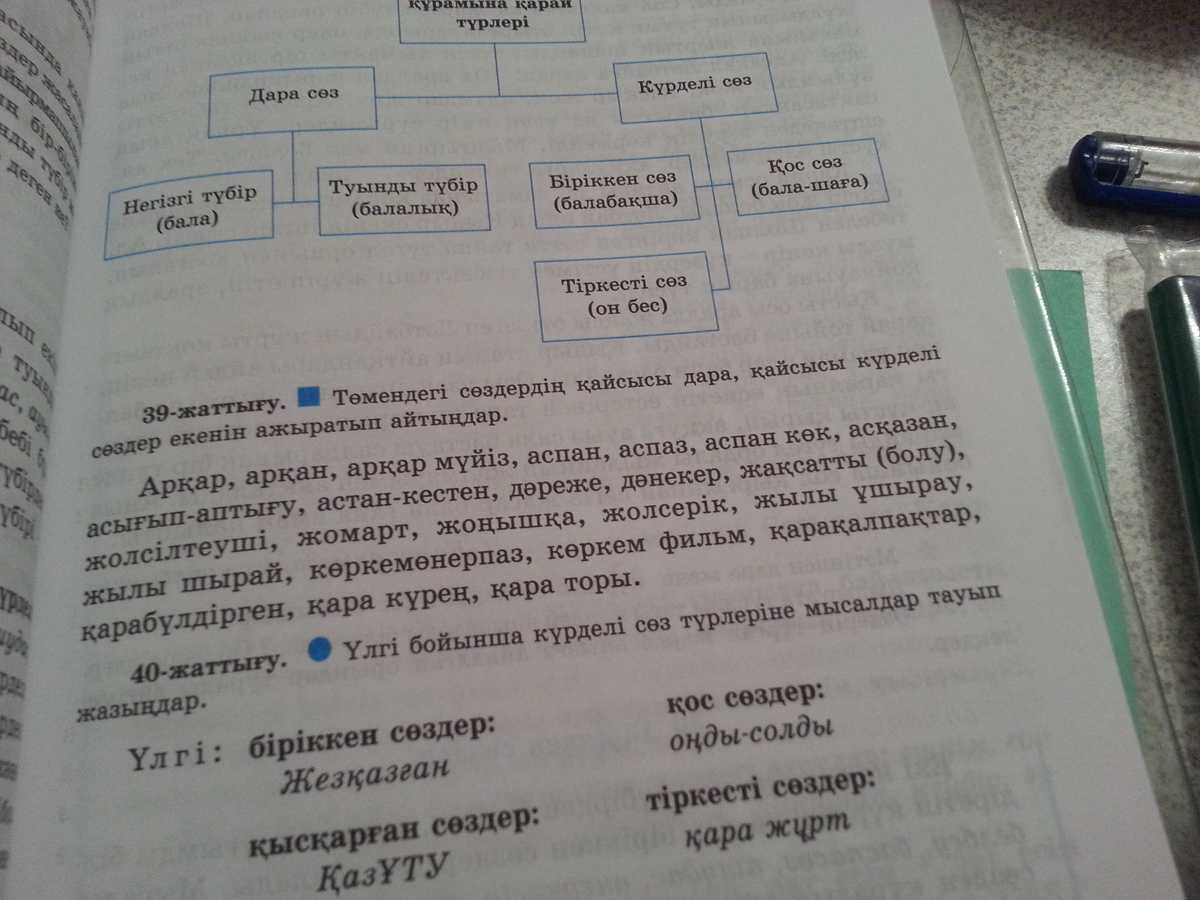 Күрделі: арқар мүйіз, аспанкөк, асқазан, асығып аптығу, астан-кестен, жолсілтеуші, жылы ұшырау, жылы шырай, көркемөнерпаз, көркем филмь, қарақалпақтар, қара бүлдірген, қара күрең, қара торы
