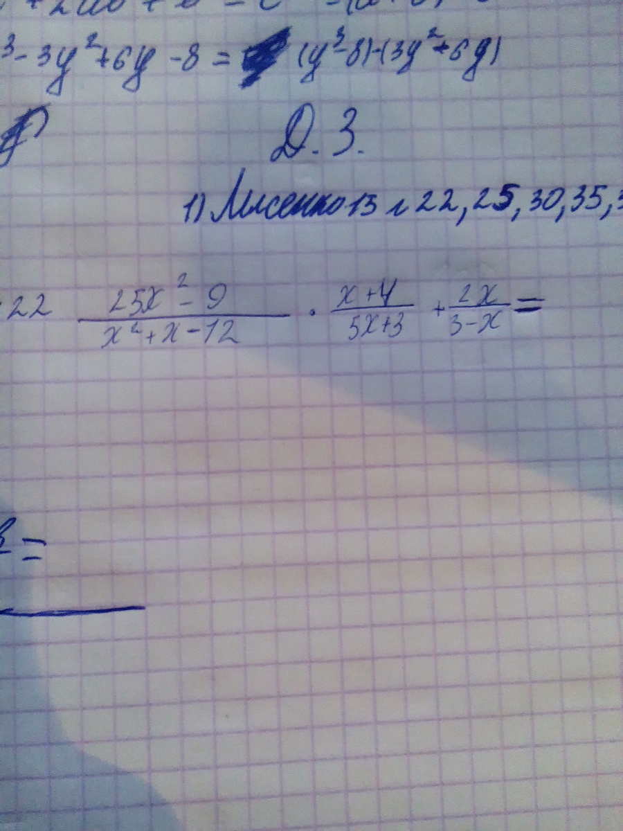 25х^2-9(черта дроби)ч^2+х-12 •х+4(черта дроби)5х+3+2х(черта дроби3-х)