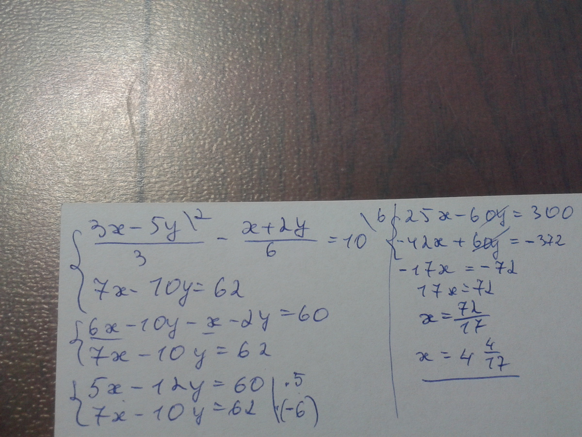 { x -5y/3 -x/6 -y/3 = 10 ; 7x-10y =62.