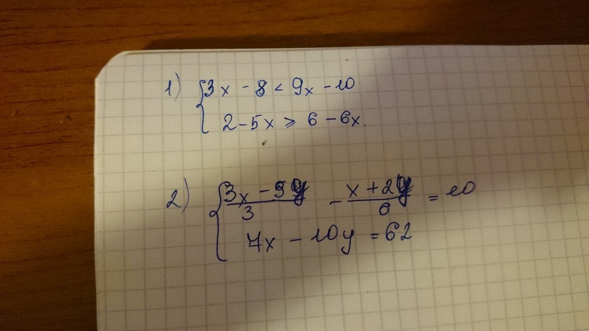 1) { 10 -8 <9x -3x ; 6x -5x ≥ 6-2 .⇔{2 <6x ; x >4 .⇔{ x >1/3 ; x > 4 ⇒ x >4 .