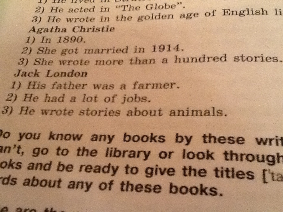 Помогите нужно задать вопросы к ответам на английском языке я застряла на 3 ем покажу ответ и перевод : ответ : (Jack London) He wrote stories about animals. Вопрос : ( на русском языке) Про кого он писал истории ? . Помогите умоляю срочно !!!!!!!!!! Есть и фото ответа