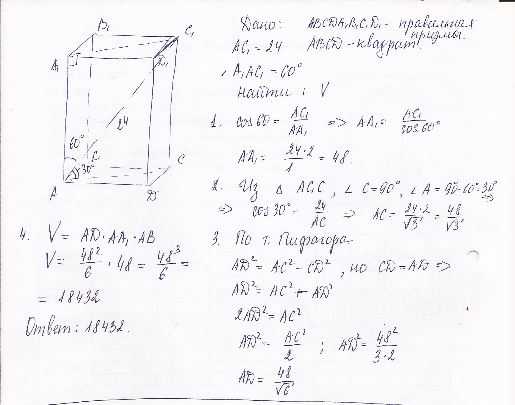 диагональ правильной четырехугольной призмы равна 24 см. Она образует с прилегающей к ней стороной основания угол равный 60 градусов. Вычислите объем призмы.