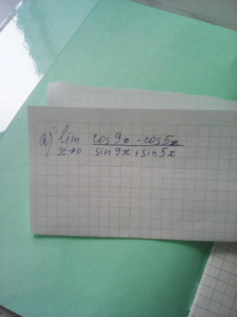 lim_{x to 0}  frac{cos9x-cos5x}{sin9x+sin5x}= lim_{x to 0}  frac{-2sinx7x*sin2x}{2sin7x*cos2x}=-lim_{x to 0}  frac{sin2x}{cos2x}=-lim_{x to 0} tg2x=0