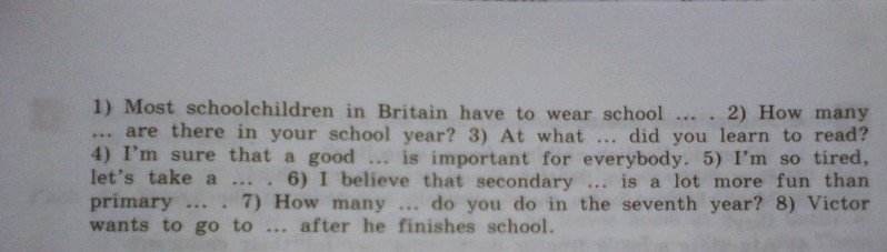 Слова которые нужно вставить: age, college, break, education, subjects, uniforms, term, school