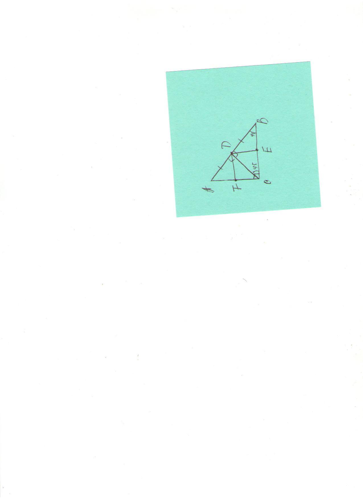 1. Треугольник ABC- равнобедренный прямоугольный треугольник (угол C = 90○). Середины сторон AB, BC, CA обозначены соответственно точками D, E, F. Проведены отрезки DC, DE, DF. Докажите, что точка D будет на равном расстоянии от вершин данного треугольника.